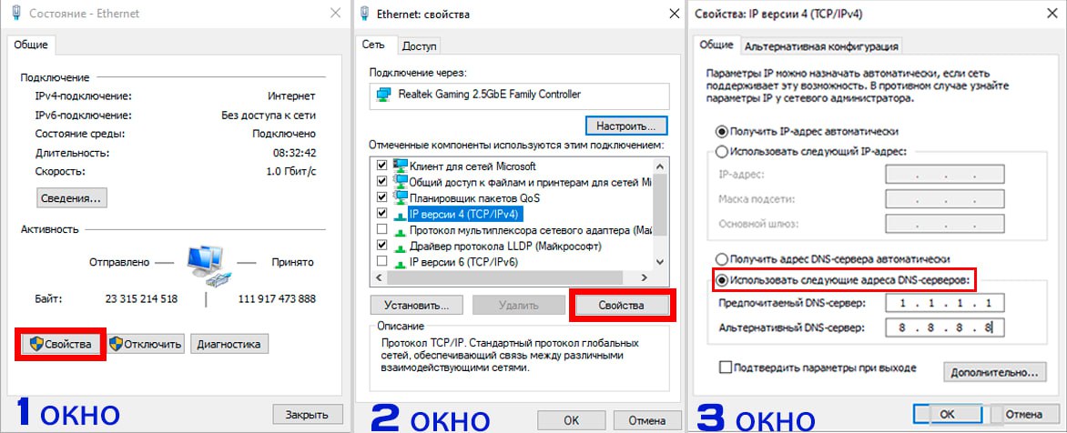 В первом окне выбираете "Свойства", во втором окне находите IP версия 4 (TCP/IPv4) выбираете, и нажимаете "Свойства", в третьем окне выбираете Использовать следующие адреса DNS-серверов, и пишите значения публичных DNS есть разные варианты